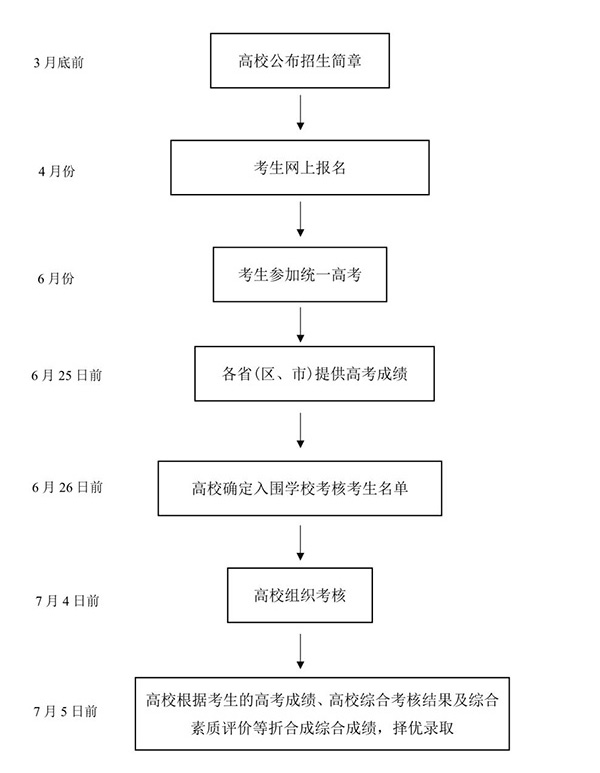 考生高考成绩、高校综合考核结果及综合素质评价情况等,按比例合成考生综合成绩(高考成绩所占比例不得低于85%),并根据考生填报志愿,按综合成绩由高到低确定录取名单。