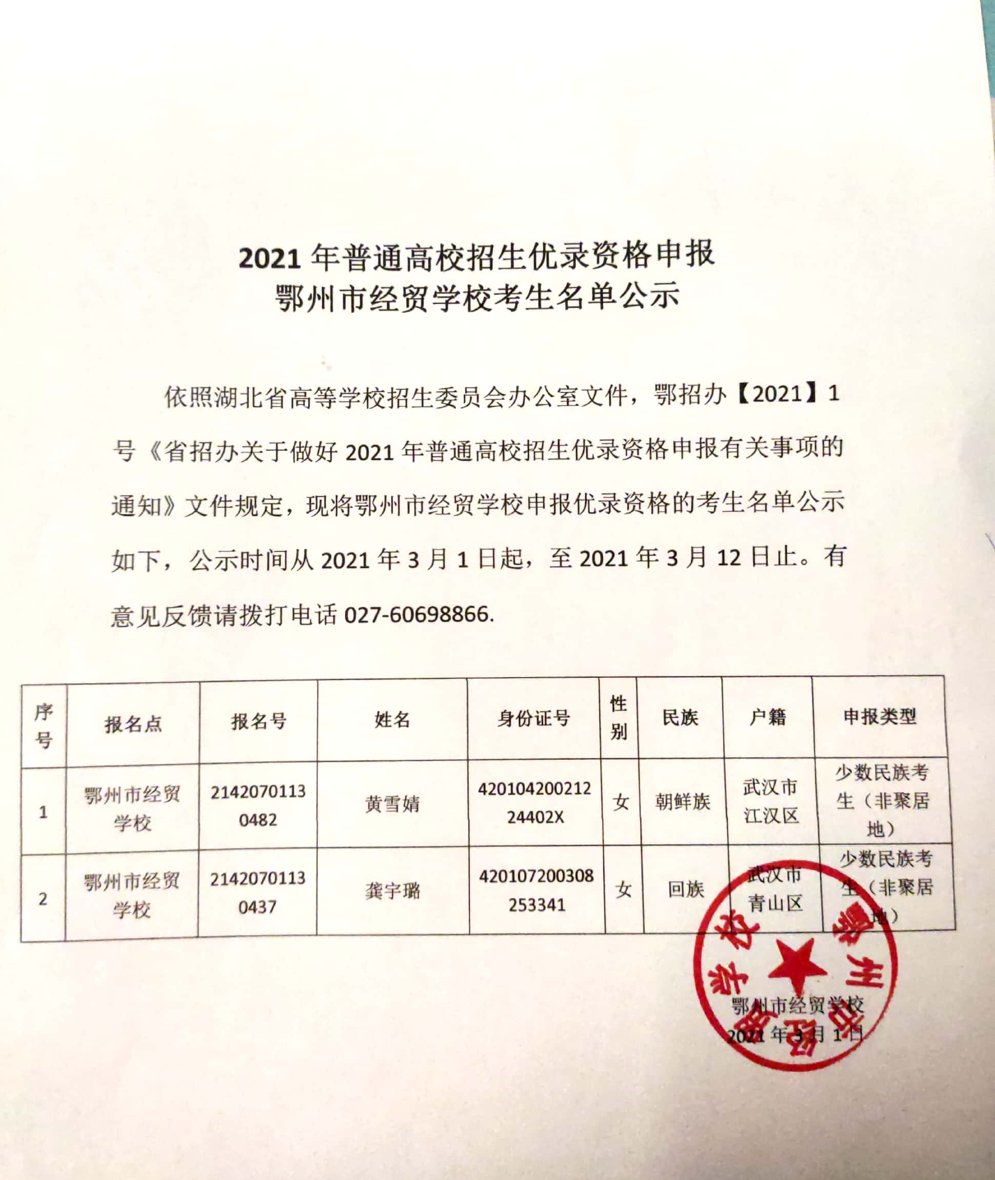 【优录】2021年普通高校招生优录资格申报 经贸学校考生名单公示