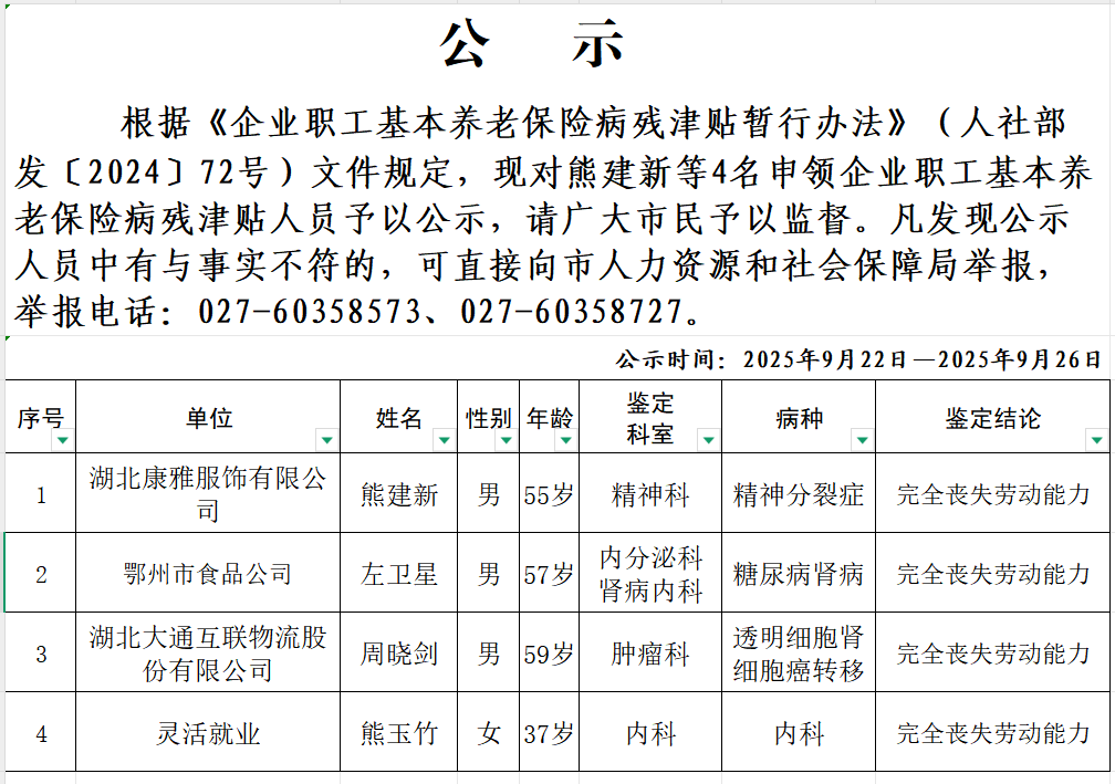 鄂州市2025年9月申领企业职工养老保险病残津贴人员公示