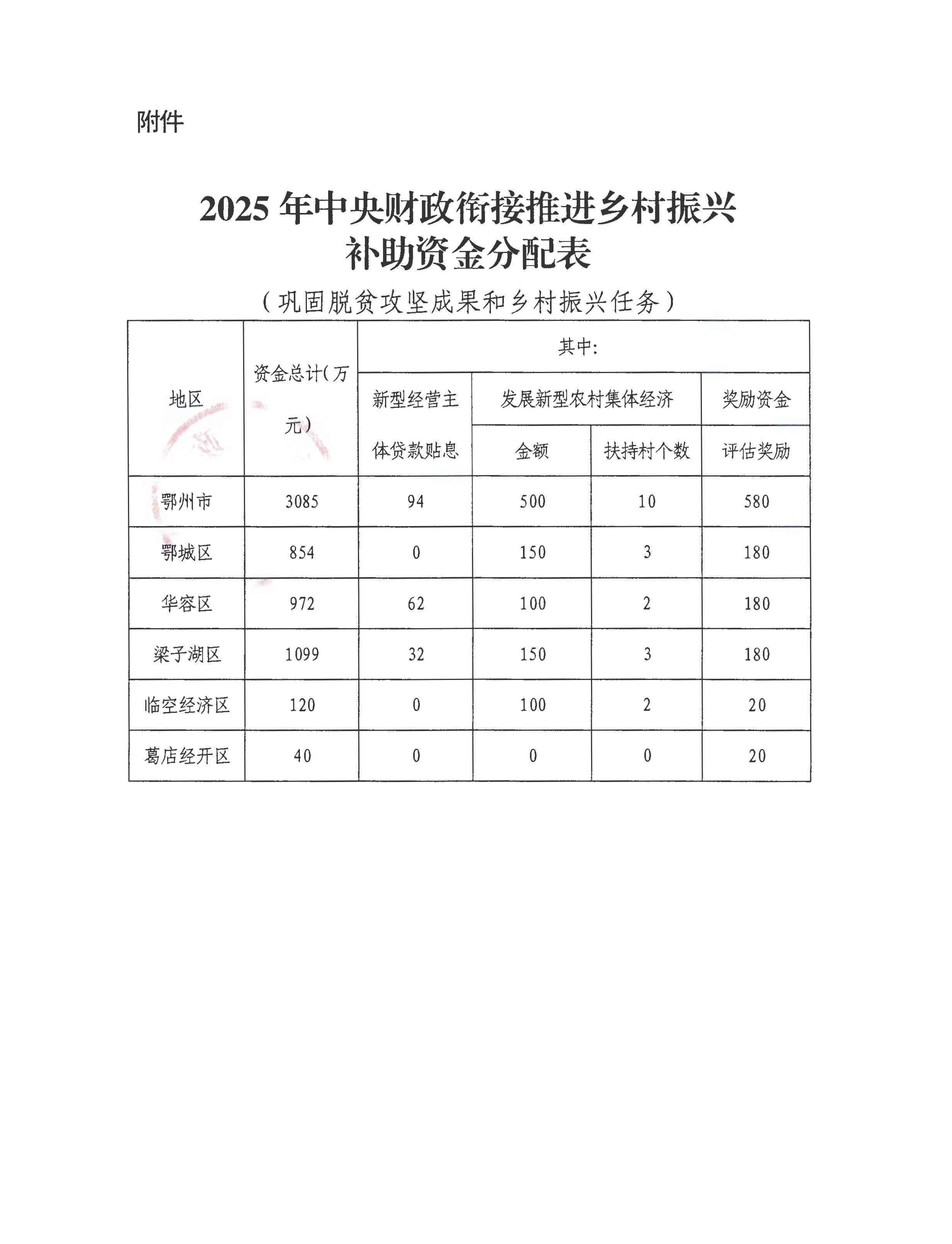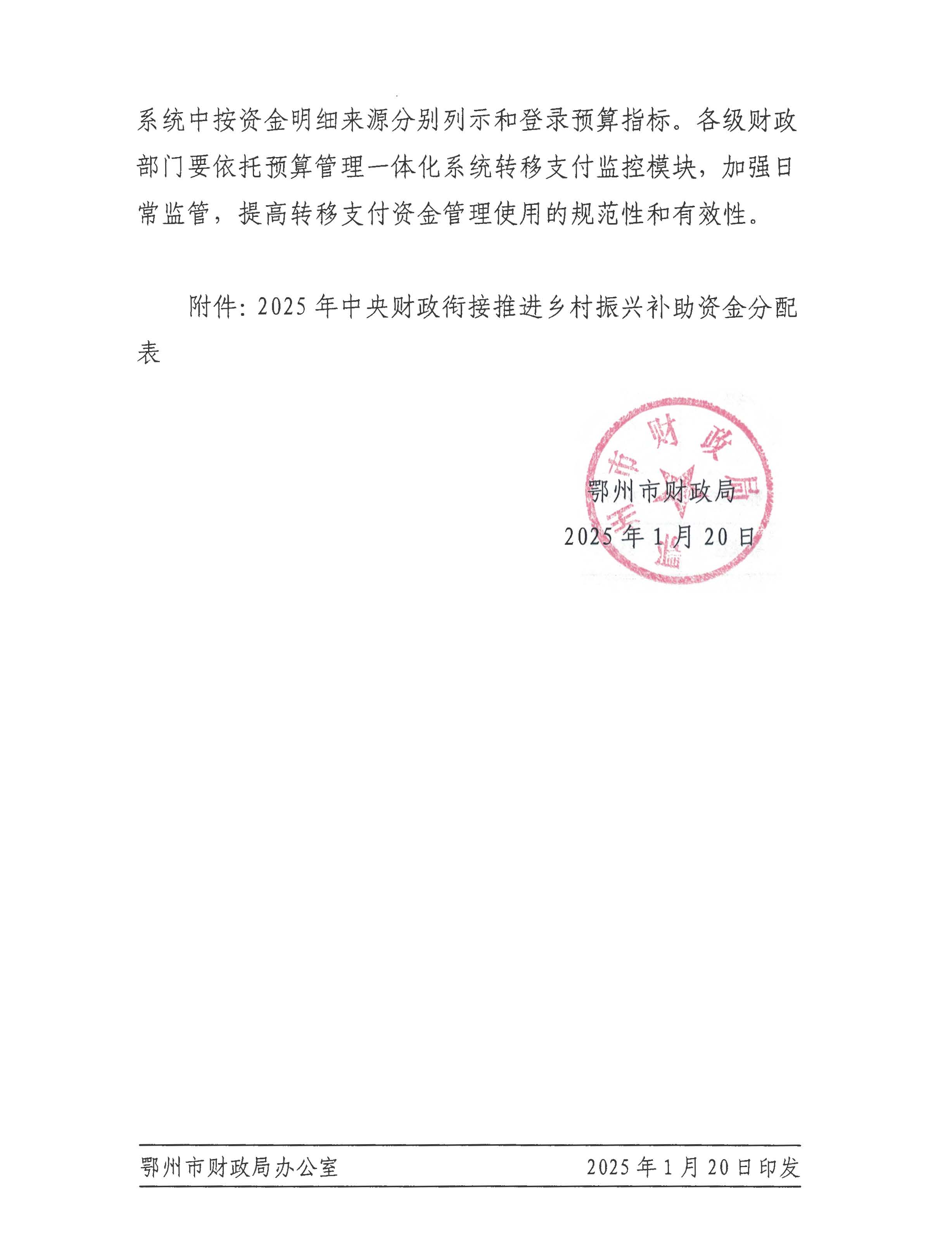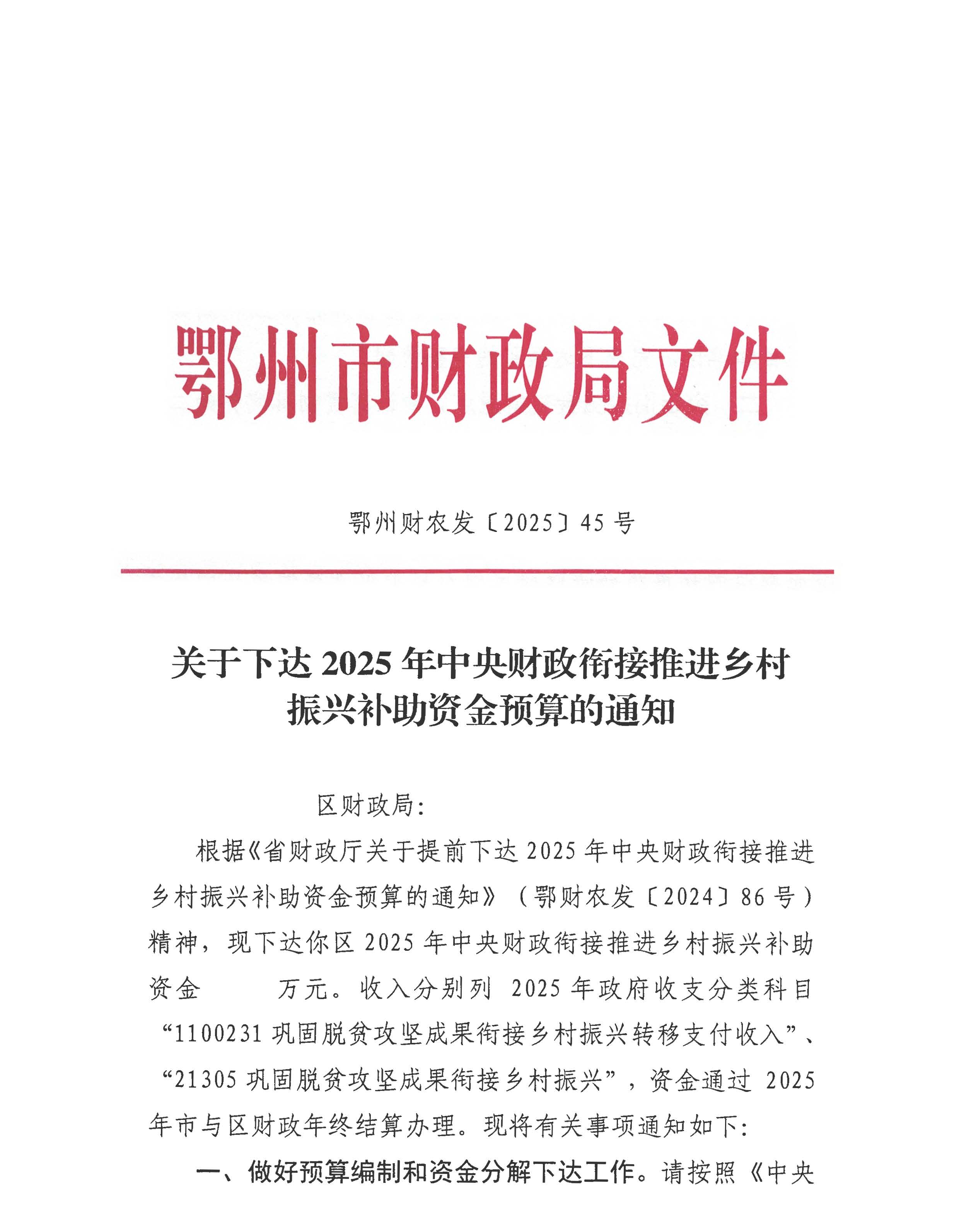 鄂州财农发【2025】45号关于下达2025年中央财政衔接推进乡村振兴补助资金预算的通知