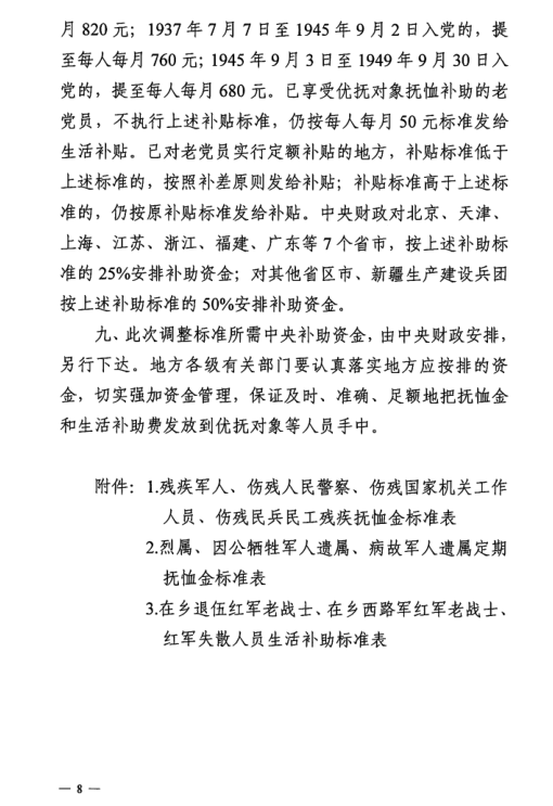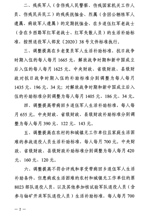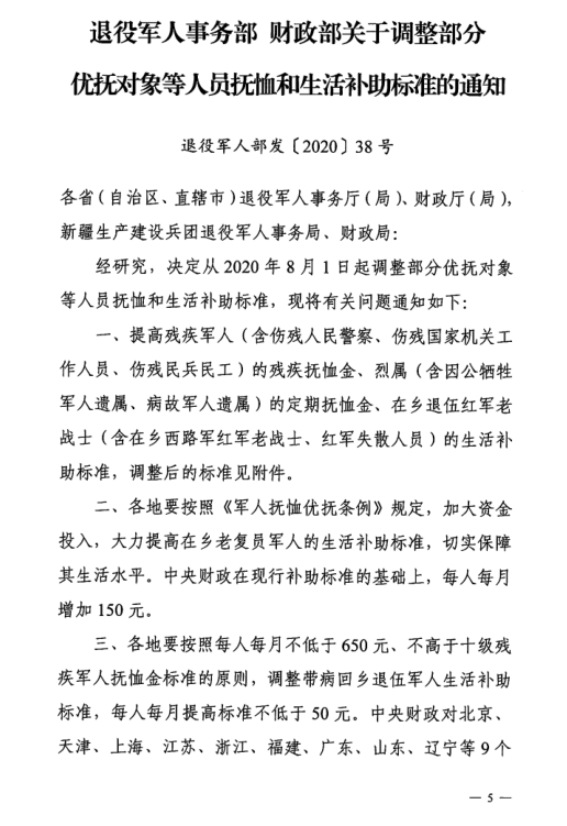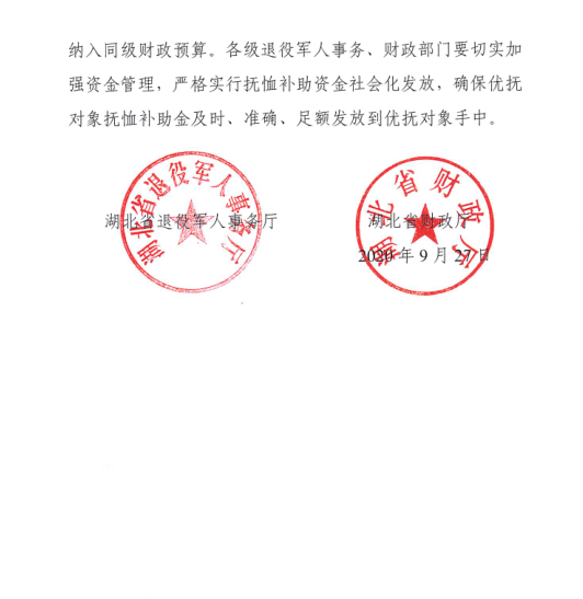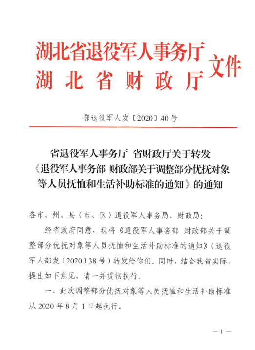 省退役军人事务厅 省财政厅关于转发《退役军人事务部 财政部关于调整部分优抚对象等人员抚恤和生活补助标准的通知》的通知(鄂退役军人发[2020]40号)