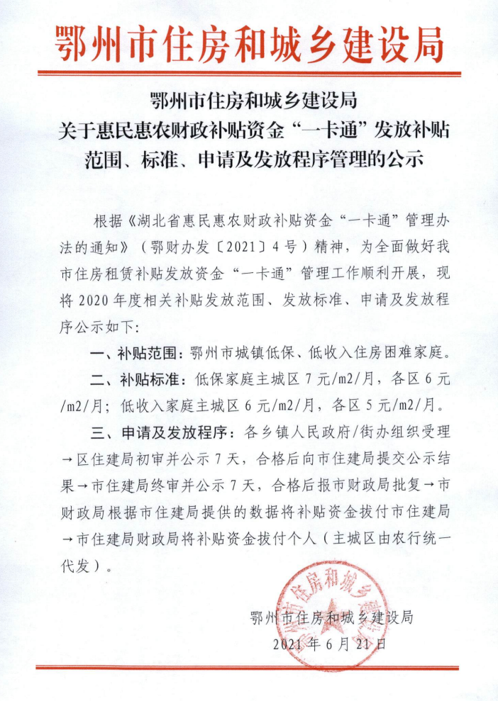 鄂州市住房和城乡建设局关于惠民惠农财政补贴资金“一卡通”发放补贴范围、标准、申请及发放程序管理的公示
