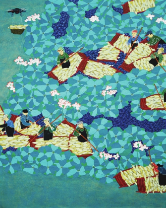 《荷塘藕乡》以鄂州荷塘挖藕场景为创作题材,通过鲜活明快的色彩,生动展现农民劳作的场景与丰收的喜悦。