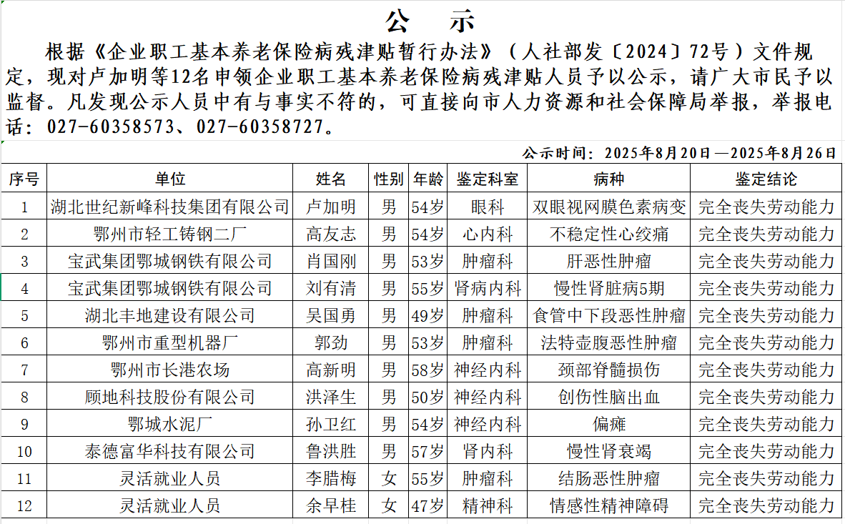 鄂州市2025年8月申领企业职工养老保险病残津贴人员公示