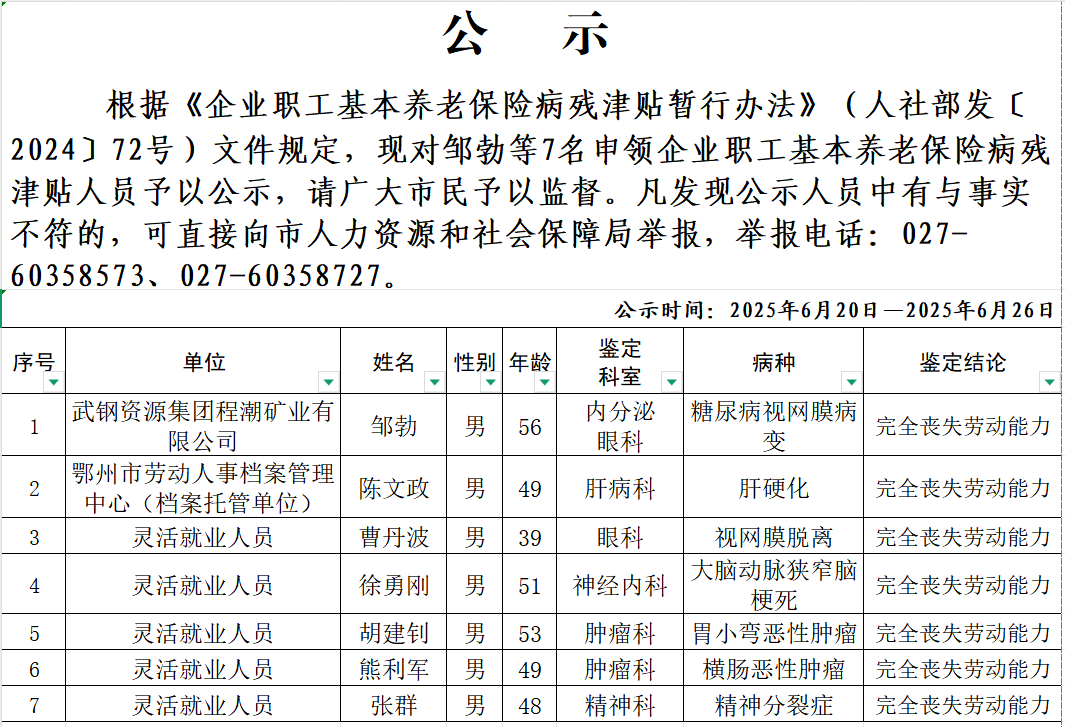鄂州市2025年6月申领企业职工养老保险病残津贴人员公示