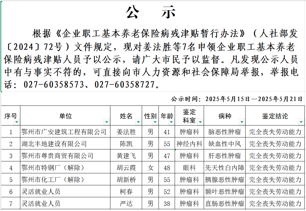 鄂州市2025年5月申领企业职工养老保险病残津贴人员公示