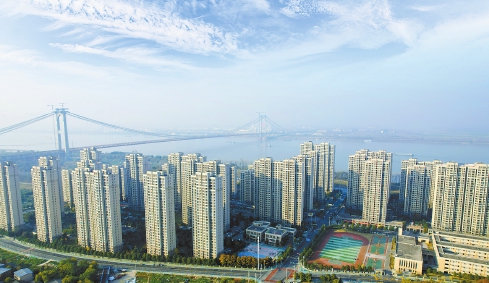 高楼林立的燕矶安置社区,紧邻建设正酣的鄂州长江大桥。安居盛景与建设热潮相映成辉。