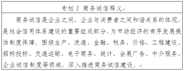 商务诚信是社会信用体系建设的重点。加快商务诚信建设,是促进市场公平竞争、维护市场正常秩序的基础,是维护商务关系、降低商务运行成本的保障。