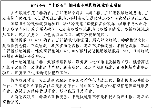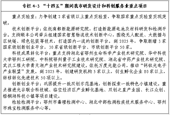 围绕“稳链、强链、补链”,推进现代服务业与先进制造业深度融合,以葛店国家电子商务示范基地为载体,系统构建信息、营销、售后等个性化服务体系,柔性制造、智慧工厂等智能化生产体系,电子商务、金融、物流等社会化协同体系。依托临空经济区和葛店经开区,加快发展智能工厂、工业互联网、生产共享平台、总集成总承包、全生命周期管理、服务衍生制造、网络协同制造、现代供应链、融资租赁、工业旅游等新业态模式,建设一批面向制造业的生产服务支撑平台,打造一批知识密集型生产性服务业集群,构建全产业链区域服务体系。培育一批“两业”(先进制造业与现代服务业)融合试点(园)区和试点企业,并给予服务业发展引导资金支持。支持工业云计算和大数据中心建设,构建全国乃至全球领先的航空货运大数据处理中心和应用平台。推进工业互联网标识解析产业化应用,培育和引进一批工业互联网解决方案提供商,完善工业互联网生态体系,重点支持宝武集团鄂钢公司等重点骨干企业搭建工业互联网平台。