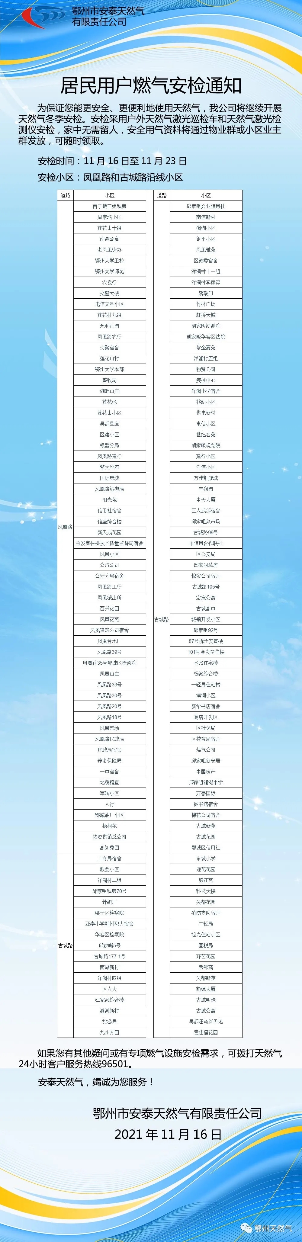 凤凰路和古城路沿线小区居民用户燃气安检通知