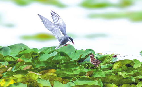 8月15日,在梁子湖水域,成群结队的须浮鸥或嬉戏觅食,或筑巢育雏,它们时而低空盘旋,时而掠过水面捕食,成为湖区一道亮丽的生态风景线。