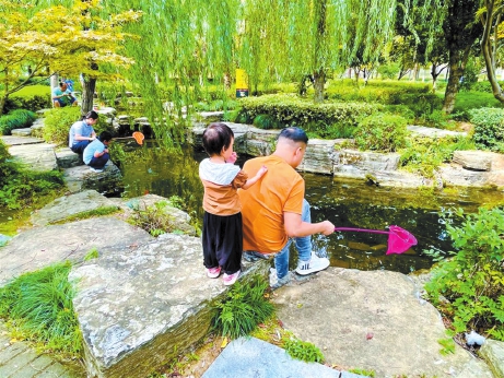 西山公园景观湖边,家长无视警示牌,带着孩子在浅水区捞鱼玩。