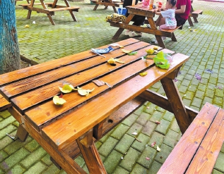 莲花山风景区的休息区域,桌椅和地面上散落着果皮和零食包装袋。