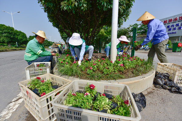 5月27日,我市园林绿化部门组织绿化工人在鄂州火车站东面12号路种植时令花卉,美化火车站周边环境。记者叶雁翅摄