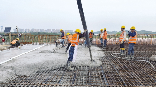 工人们在浇筑花马湖大桥现浇梁右幅。全媒体记者 周璟 摄