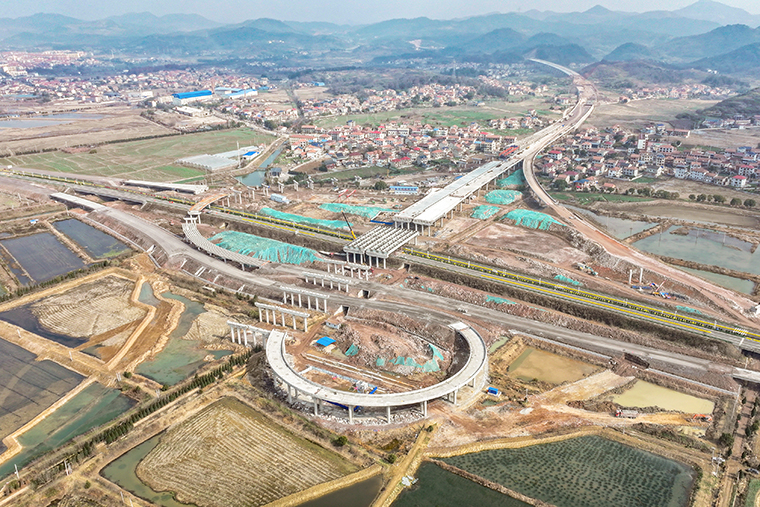 图为近日航拍的鄂州花湖机场高速公路二期工程梁子湖区段太和南枢纽互通施工现场。承建方项目部六工区负责人许道连介绍,太和南枢纽互通桥面工程计划于4月20日完工,整个工区已完成总工程量的87%,正全力向今年6月达到通车条件目标冲刺。项目通车后,从黄石大冶至花湖国际机场的车程将由1小时压缩至约20分钟,不仅显著提升武汉都市圈交通效率,更将增强花湖国际机场货运枢纽辐射能力。