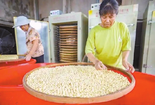 在烘烤车间,阵阵莲子清香扑面而来。工人刘又云盯着温控仪表,不时调整设备参数。“我以前在外地打工,听说村里建了加工厂,立马就回来了。”他笑着说,“现在不仅能照顾家里的老人和孩子,每月还能挣4000多元工资,比在外打工踏实。”据姜立千介绍,目前加工厂已带动20名村民稳定就业,在莲子采购和加工旺季,每天还聘请300名农民参与分拣、加工,人均月增收3000元以上。