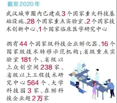 截至2020年,武汉城市圈内已建成3个国家重大科技基础设施、28个国家重点实验室、2个国家技术创新中心、1个国家临床医学研究中心。圈内,44个国家级科技企业孵化器、16个国家级技术转移示范机构遍地开花。