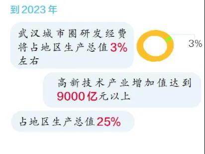 到2023年,武汉城市圈研发经费将占地区生产总值3%左右,高新技术产业增加值达到9000亿元以上,占地区生产总值25%。